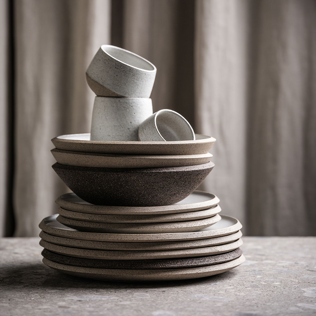 Chamotte stoneware forms the foundation of the collection. The pieces are RAM-pressed in precision molds and finished by hand, where the surface is carefully scraped to reveal the natural texture of the chamotte clay, preserving sculptural forms that are both robust and refined.