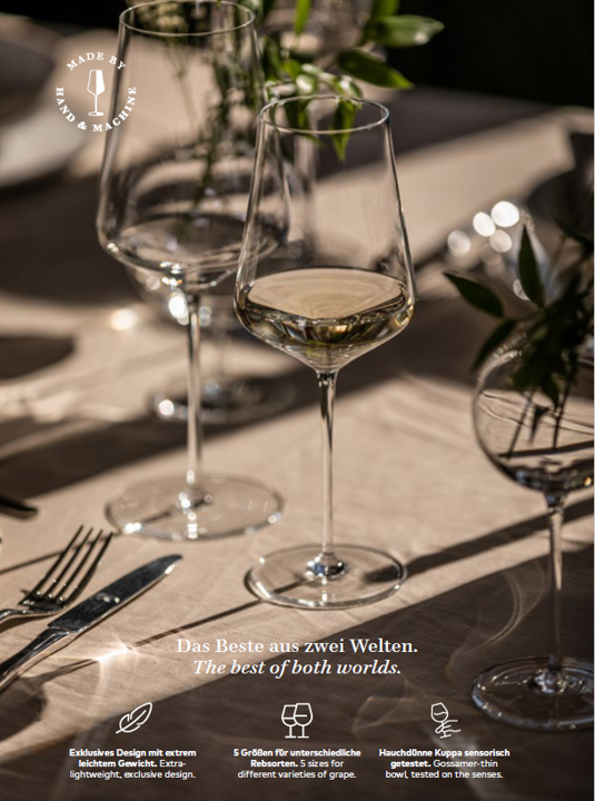 In addition to handmade premium products that are unsurpassed in their manufactory quality, the brand assortment includes select machine-made series that stand out for their unique designs and exquisite product value. Design cooperations with sommeliers, vintners and international top chefs further promote the unique properties of the Zwiesel Glas product assortment.